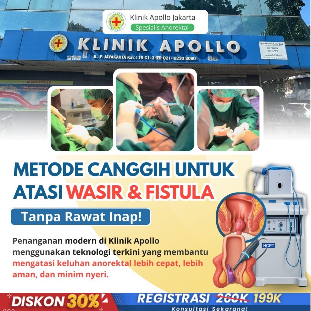 Klinik Apollo berfokus pada pengobatan wasir TANPA OPERASI, sehingga tidak perlu rawat inap dan bisa langsung beraktivitas.
